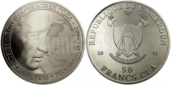 На аверсе монеты изображён герб Камеруна, идет надпись по верхнему краю монеты: REPUBLIQUE DU CAMEROUN. Под гербом страны — номинал монеты, 50 франков КФА. На реверсе монеты изображен Владимир Путин на фоне земного шара. По верхнему краю монеты надпись: «В. Путин — человек года». По нижнему краю монеты надписи: PERSON OF THE YEAR и PERSONNALITE DE L’ANNEE.