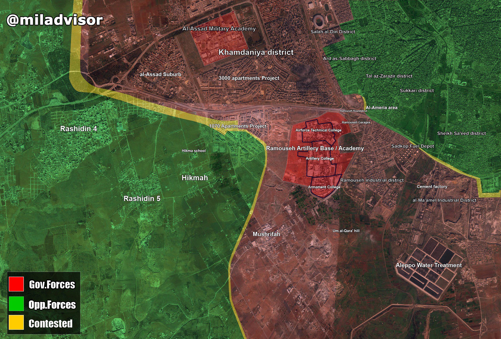 Для штурма квартала армии потребовалось всего 2 дня, чтобы отчитаться о том, что установлен контроль над ключевыми пунктами района - пекарней, муниципалитетом, почтовым отделением. Боевики под ударами САА были вынуждены отступать в квартал Аль-Америя, откуда они 2 дня назад безуспешно пытались атаковать позиции САА в районе развязки Рамусеха. Так же армия полностью заняла район гаражей и развязки Рамусеха.