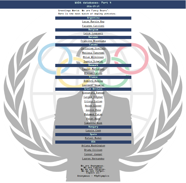 Хакеры Fancy Bears выложили четвёртую часть документов об использовании спортсменами запрещённых веществ «в терапевтических целях». Согласно новым данным, среди спортсменов, которые употребляли допинг с разрешения Всемирного антидопингового агентства (WADA), оказался испанский теннисист Рафаэль Надаль. Кроме того, в список попали бегун из Великобритании Мо Фарах и венгерский пловец Ласло Чех. Всего в новом списке значатся 27 фамилий. Среди них спортсмены из Аргентины, Бельгии, Канады, Дании, Испании, США, Бурунди, Франции и Великобритании.