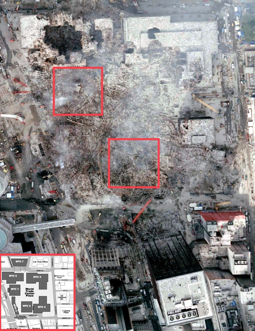 3. Фото со спутника, сделанное 15-го сентября, "когда осела пыль" и фото с вертолета, сделанное примерно в это же время (красными квадратиками выделено месторасположение ВТЦ-1 и ВТЦ-2):