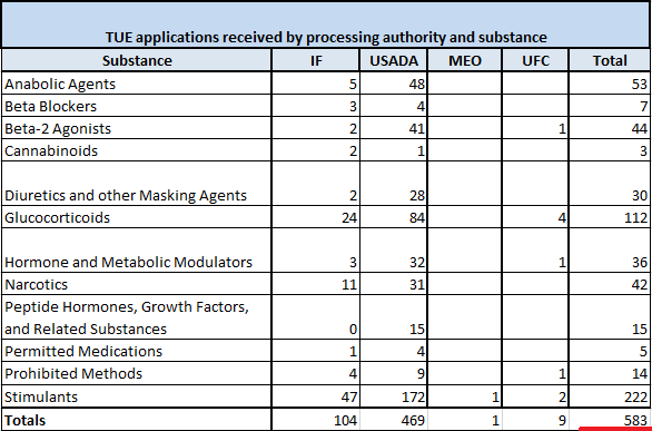 Отмечается, что в 2015 году американцам было выдано 583 TUE. Эта цифра отличается от официальной информации Американского антидопингового агентства (USADA). Там говорится о 653 запросах на TUE, в ответ на которые было выдано 402 разрешения.