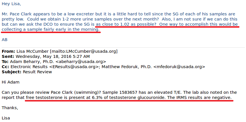 В одном из писем говорится, что пловец Пэйс Кларк имеет повышенный уровень тестестерона. Однако USADA просит пересмотреть результат, чтобы сгладить любые несоответствия.