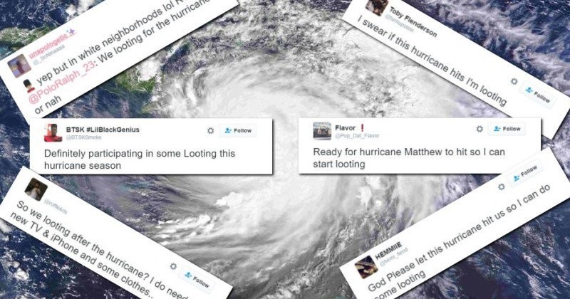 Журналисты Infowars насобирали десятки твитов жителей Флориды и прилегающих штатов, которые по-детски радуются приходу урагана Мэтью: "Сезон ураганов - сезон грабежей", "Хочу ТВ и айфон и гардероб обновить", "Ураган - нет электричества - можно грабить". "Но только в белых районах!" - поправляет расово правильный пользователь.