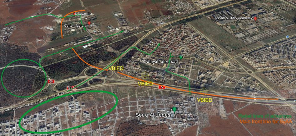 Поэтому пока боевики отбивают атаки САА в квартале Аль-Ассад, происходят попытки поджимать позиции САА к западу от квартала Аль-Захра, где были захвачены развалины одной из ферм к западу от военной базы Захра. Можно предположить, что если фронт перед Хамаданией встанет, боевики попробуют перенацелить удар по кварталу Захра, предварительно организовав наступление на военную базу расположенную к западу от квартала. Совсем уж больших дивидендов это не принесет, но так по крайней мере они могут поддерживать некую наступательную динамику.