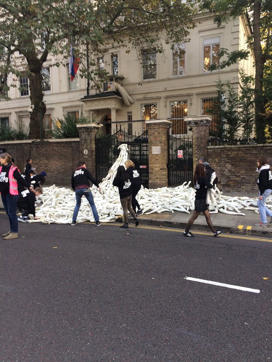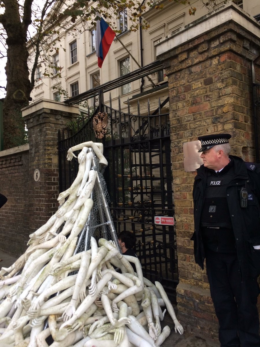 Сегодня под российским посольством в Лондоне "борцы за мир" устроили акцию, заблокировав главный вход жуткой инсталляцией. Активисты двух кампаний - "Сирийская кампания" и "Солидарность с Сирией в Великобритании" забросали территорию перед российским посольством пластиковыми конечностями с манекенов взрослых и детей. Протестовали против "уничтожения Алеппо". Мотивация - попытка сорвать планы Асада и Путина и предотвратить "дальнейший ад", в котором находятся жители Алеппо.