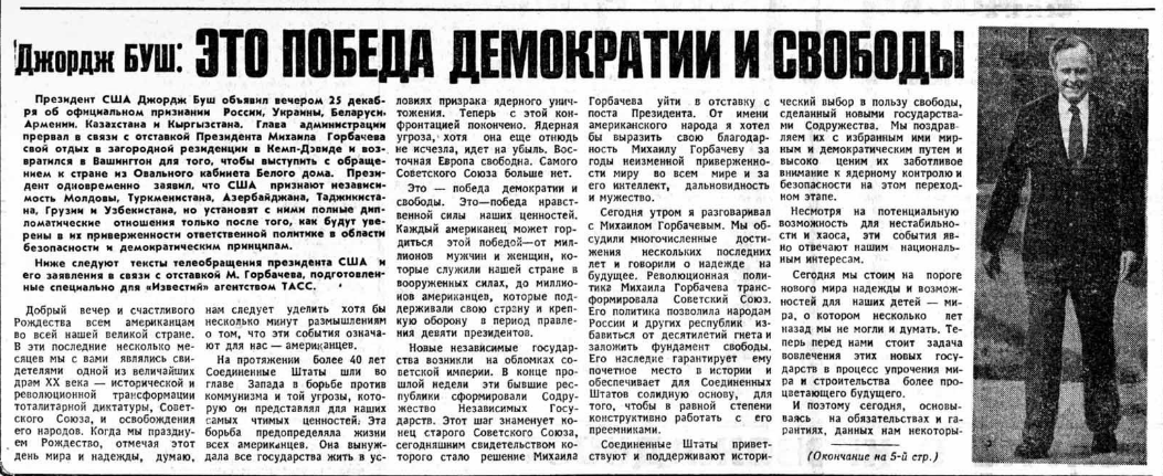 И глубоко закономерно, что беловежские подписанты (трое из шести) отправились отмечать 25 лет развала их руками Советского Союза в США. 25 декабря 1991 года тогдашний президент США Джордж Буш-старший официально объявил о признании независимых государств, в первую очередь России, Украины, Беларуси, Армении, Казахстана и Кыргызстана. Развал СССР он назвал «победой демократии и свободы», «победой нравственной силы наших ценностей» и заявил, что «каждый американец может гордиться этой победой». Буш поприветствовал государства, учреждённые на обломках СССР, и отметил: «Несмотря на потенциальную возможность для нестабильности и хаоса, эти события явно отвечают нашим национальным интересам».