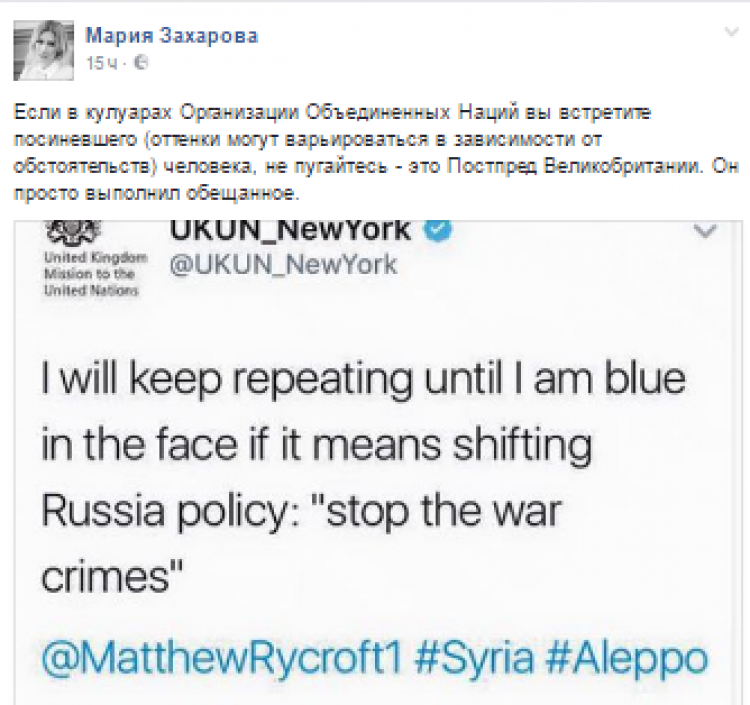 В Twitter появилось высказывание постпреда Великобритании, в котором он заявил, что готов повторять до посинения о том, чтобы Россия прекратила военные преступления в Сирии. На это язвительно отреагировала представитель МИД РФ Мария Захарова, сообщив, что если в скором времени члены ООН встретят в кулуарах свое организации посиневшего Мэтью Рикрофта, то пугаться им не стоит. Это будет означать, что постпред Великобритании просто исполнил свое обещание. Также Захарова в шутливой форме сообщила, что оттенки «синевы» могут варьироваться в зависимости от обстоятельств.