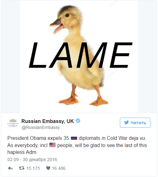 Западные СМИ оценили "троллинг" со стороны посольства России в Лондоне, которое ответило на решение Барака Обамы выслать 35 российских дипломатов твитом с изображением хромой утки.