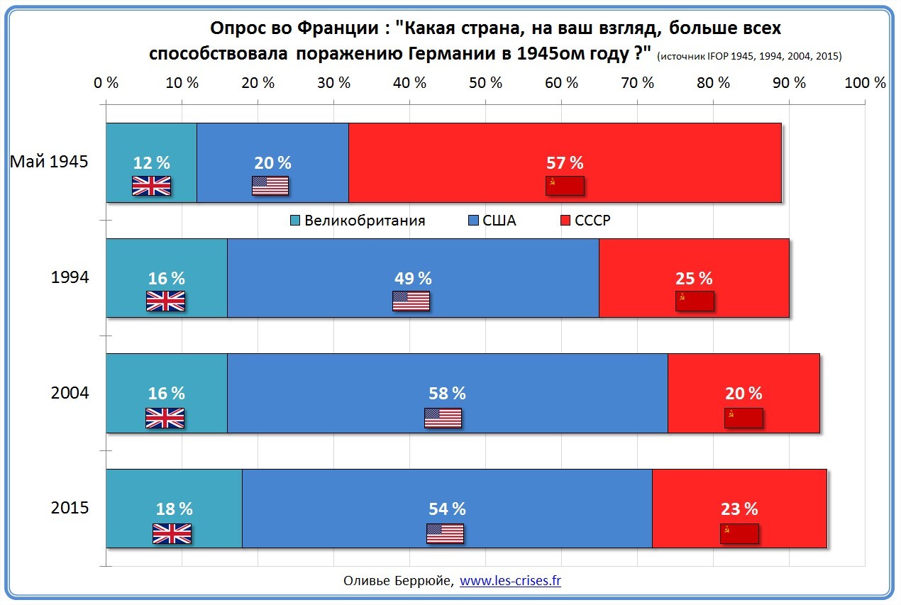 Французский блог www.les-crises.fr собрал результаты опросов французов по теме "Кто внёс наибольший вклад в победу над нацистской Германией: СССР, США или ВБ", проводившихся "французским ВЦИОМом" в 1945, 1994, 2004 и 2015.
