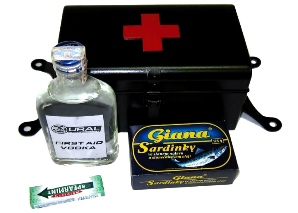 Более того — на специальных кронштейнах к коляске прикручены малая пехотная лопата, канистра для топлива, насос и набор инструментов, но самый шик — специальная «аптечка». В футляре с красным крестом от любопытных глаз спрятаны… бутылка водки под названием First Aid («Первая помощь»), упаковка сардин и мятная жевательная резинка. Мотоцикл Ural Ambassador Limited Edition выпущен тиражом всего в 25 экземпляров.