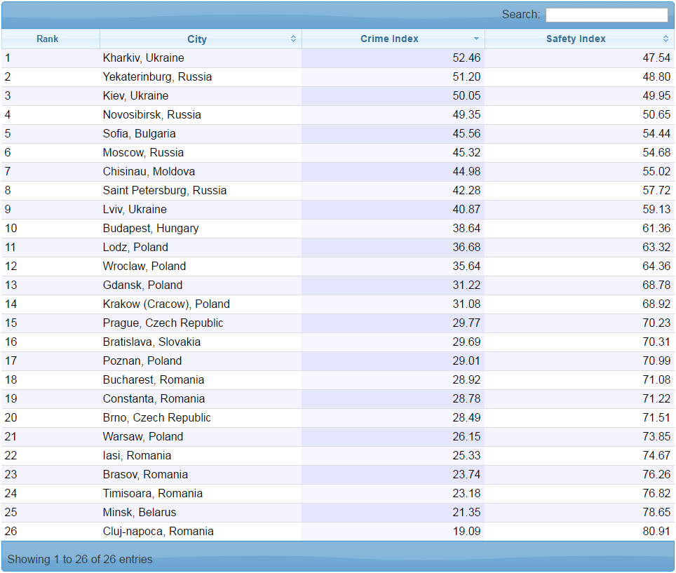 Согласно рейтингу всемирной базы данных Numbeo, самым опасным городом Восточной Европы признан Харьков, уровень преступности в котором серьезно превысил средние показатели по Восточной Европе, передает РБК-Украина.