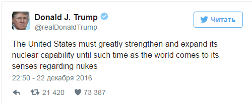 Ранее Трамп написал в Twitter, что США должны значительно укрепить и расширить возможности в области ядерных вооружений "до того времени, когда мир придет в чувство относительно ядерных бомб". Позже он добавил, что в случае гонки вооружений Америка превзойдет всех в этом процессе.