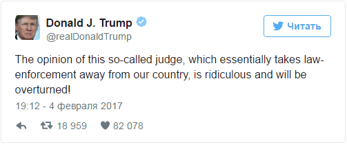 "Мнение так называемого судьи, который умалил правопорядок нашей страны, смехотворно и будет отменено", — написал Трамп на своей странице в микроблоге Twitter.