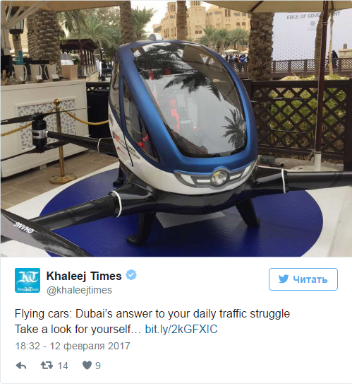 Управление дорог и транспорта Дубая (RTA) представило "летающий автомобиль" на начавшемся в городе-эмирате правительственном саммите World Government Summit, сообщает издание Khaleej Times.