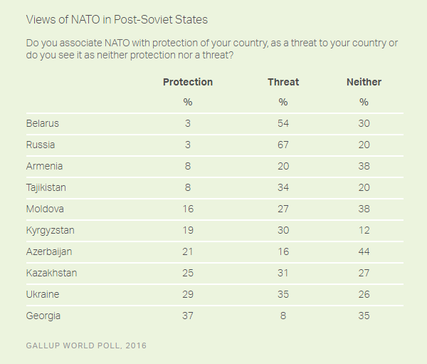 В свою очередь, большинство опрошенных в странах-членах НАТО в Восточной Европе считают альянс защитой, в частности, 62% жителей Польши, 57% респондентов из Литвы, 49% венгров, 46% жителей Чехии видят в НАТО защиту для своих стран.