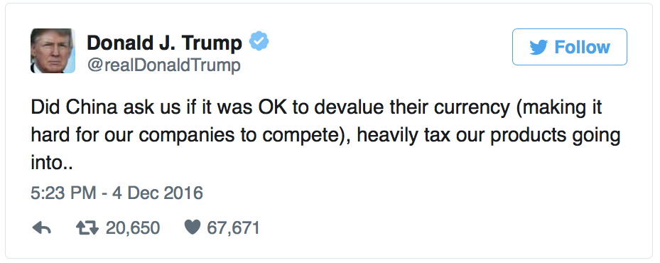 Первая из них гласит: Китай спросил нас, приемлемо ли девальвировать свою валюту (делая трудной конкуренцию для американских компаний), повышенное обложение налогами наших товаров прибывающих..