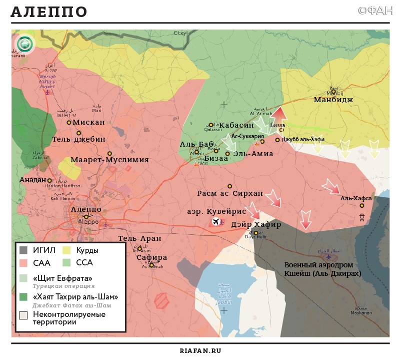 Алеппо, который до начала гражданского конфликта в Сирии традиционно рассматривался как экономическая столица страны, был полностью очищен от присутствия незаконных формирований в декабре 2016 года. В настоящее время город находится под полным контролем правительственных сил, однако бандформирования, орудующие в его восточных и северо-восточных окрестностях, систематически совершают диверсии и атаки против мирных жителей сирийского мегаполиса. В общей сложности в этом регионе с начала февраля и на сегодняшний день было освобождено уже свыше 100 городов и деревень.