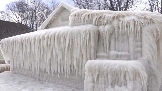 В американском штате Нью-Йорк обычный дом на берегу озера Онтарио превратился в ледяной.