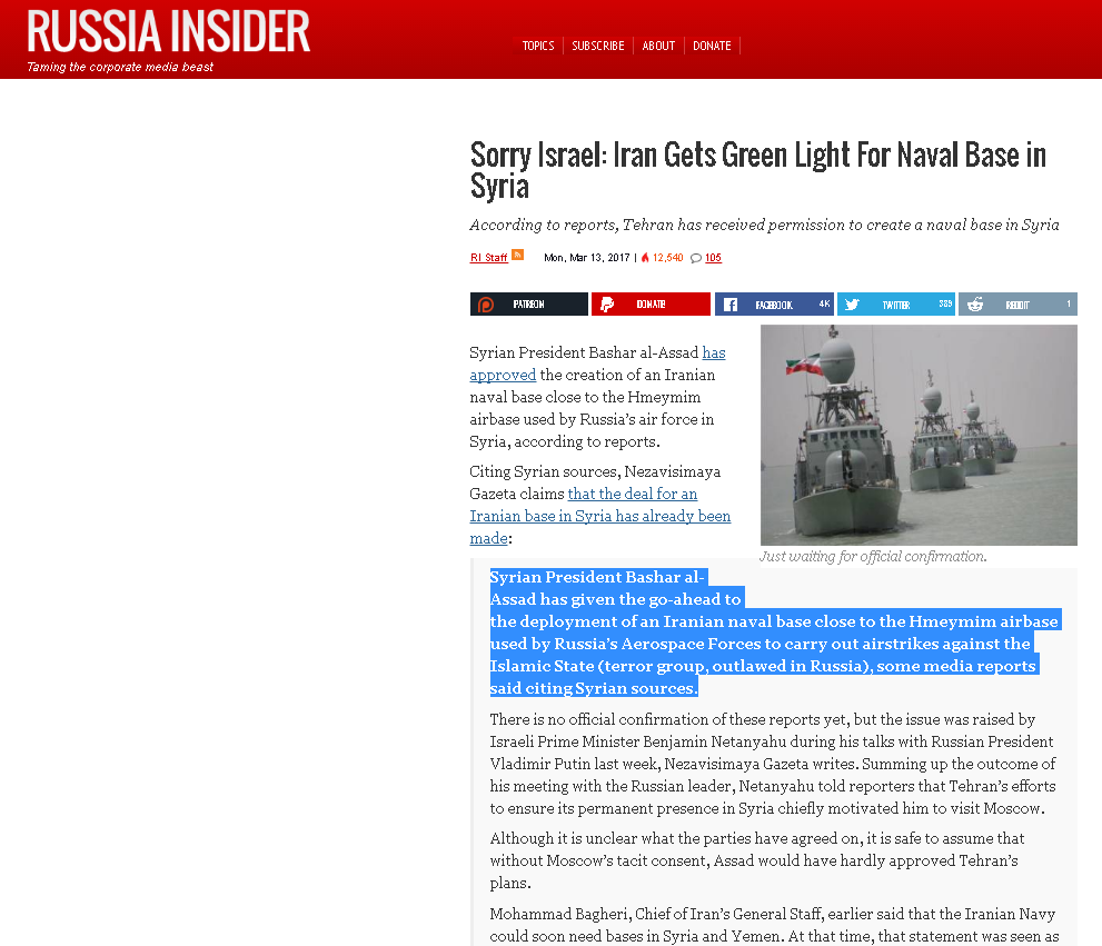 Сначала он говорит "нет" по поводу прокладки газовой трубы Катару/Саудовской Арвии/Израилю/ЕС/Турции/AIPAC, затем он выгоняет всех, кто считал, что "Асад должен уйти" из их нор в Сирии, и теперь он ссать хотел на Израиль и США, позволяя Ирану создать военно-морскую базу в Сирии.