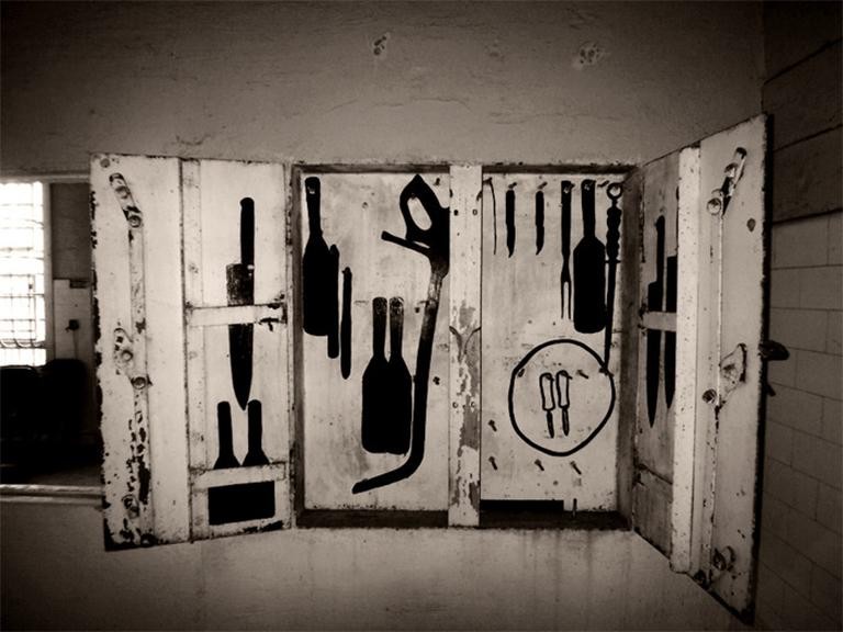 Это столовая для заключенных. Разделочные приборы должны были обязательно размещаться в соответствующих ячейках, чтобы — не дай Бог! — сразу заметить их отсутствие. При этом каждому узнику полагались ложка, вилка и нож. Вроде бы, какое уважение к правам человека! Однако, охрана очень нервничала от осознания того факта, что несколько сот опаснейших злодеев одновременно имеют ножи. Поэтому сверху располагался резервуар с газом — в случае беспорядков его применили бы без колебаний. К слову сказать, в нацистской Германии первая газовая камера появилась в конце 1939 года. В США для казни преступников использовалась, начиная с 1920 годов.