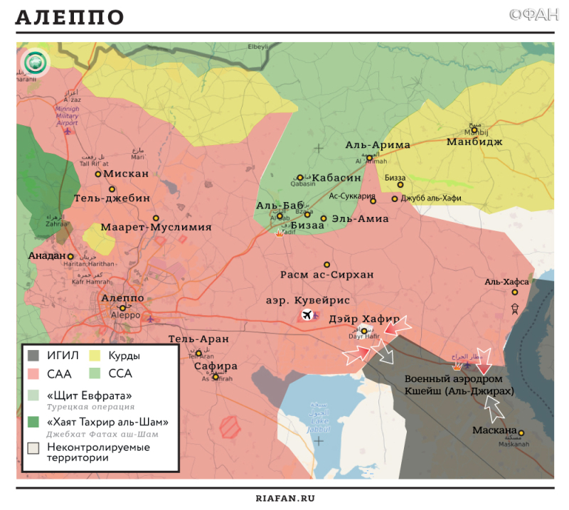 Одновременно с этим пресс-центр операции «Щит Евфрата» объявил, что курдские бойцы отбили у террористов восемь селений в районе города Ат-Табка на западе провинции. Десятки радикалов были ликвидированы в ходе ожесточенных боев. Ранее командование операции выложило в интернет снимки, подтверждающие, что курдские бойцы при поддержке американского спецназа установили по меньшей мере частичный контроль над стратегически важной Евфратской ГЭС близ Ат-Табки. Ожесточенные бои в районе объекта продолжаются.