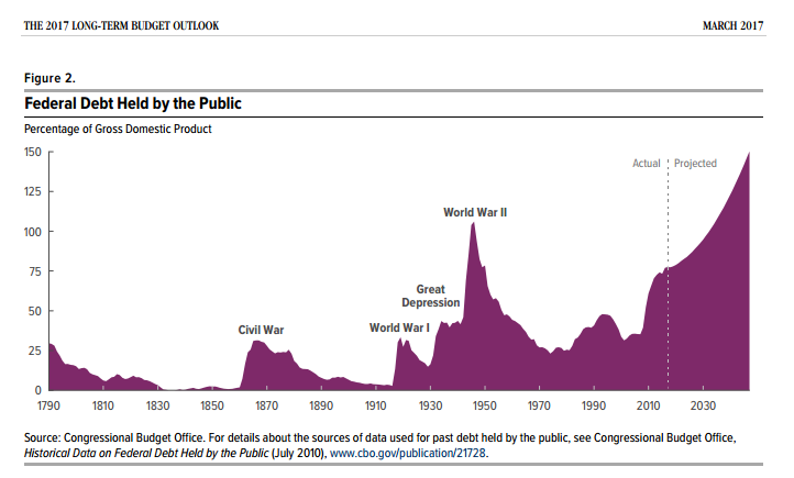 Управление Конгресса США по бюджету (Congressional Budget Office, CBO) выпустило отчет с долгосрочным прогнозом, в котором обещание Трампа обнулить госдолг США за 8 лет (см. Самое лживое обещание Трампа) почему-то не рассматривается как базовый сценарий