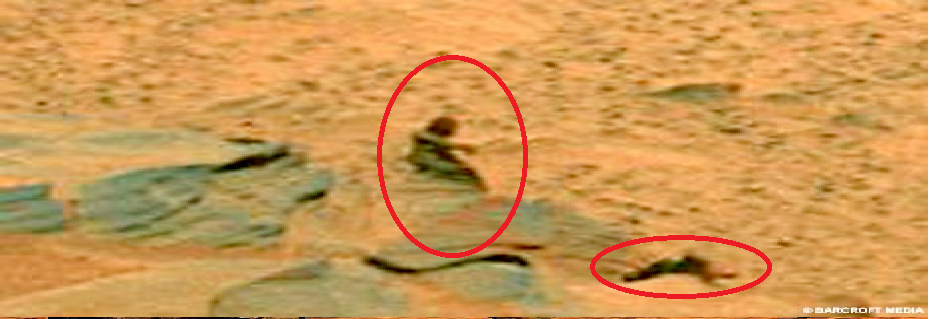 Атропоморфное образование в форме человеческой фигуры обнаружили астрономы-любители. Британский таблоид The Daily Mail разглядел в нем женщину, которая "присела на камень, словно ожидая автобус". Интересно, что первоначальное исследование снимка экспертами NASA ничего необычного на нём не выявило.