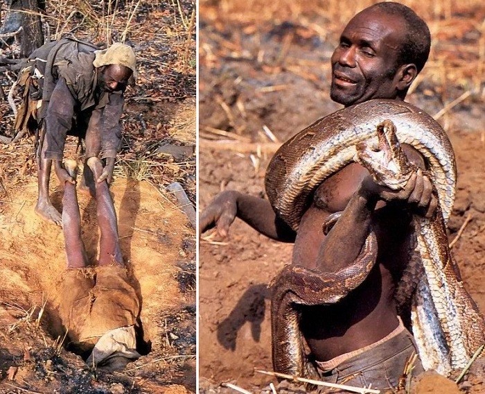 Мужчины не должны терять ни секунды: первый удерживает рогатиной голову, второй – хвост, а третий перерезает змее горло. Один из охотников снова забирается в нору за яйцами, которые считаются деликатесом. Нагруженные добычей, мужчины отправляются домой.