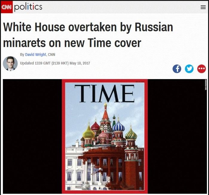 Американский еженедельный журнал Time поместил на обложку номера, который должен выйти 29 мая 2017 года, изображение Белого дома, плавно превращающегося в храм Василия Блаженного в Москве. На сайте самого журнала обложка сопровождает статью, посвященную «войне российских соцсетей с Америкой».