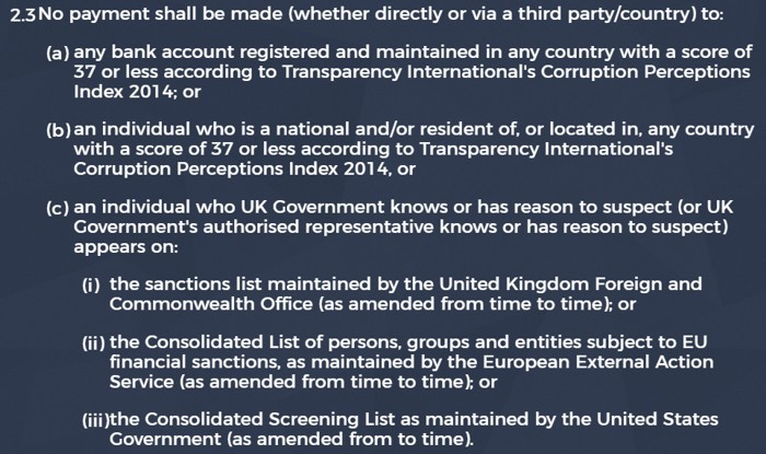 В примерном переводе это означает, что выплаты не будут производиться (ни напрямую, ни через третьи стороны/страны) на банковский счет, открытый или управляемый, или в пользу частных лиц с гражданством, статусом резидента, или находящихся в любой стране с рейтингом 37 и ниже согласно Рейтингу проникновения коррупции Transparency International 2014 года.