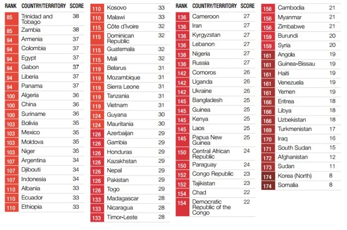 Согласно официальным данным TI CPI 2014, рейтинг 37 и ниже имеют такие страны как, например, Китай (36), Мексика (35), Белоруссия (31), Вьетнам (31), Казахстан (29), Иран (27) и Россия (27).