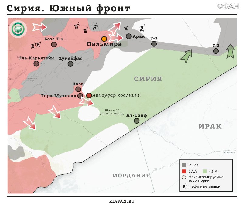 САА, Лива Аль-Кудс, 5й Штурмовой корпус и Силы национальной обороны возобновили натиск на ИГИЛ восточнее древнего города Пальмира, цель которого – занять деревню Арак и близлежащее газовое месторождение Арак. Правительственные войска продвинулись более, чем на 3 км к северо-востоку от Пальмиры и поднялись на несколько высот в районе к северу от Арака. Данным наступлением правительственные силы собираются окружить отряды ИГИЛ в районе Арака и установить огневой контроль над данной территорией.