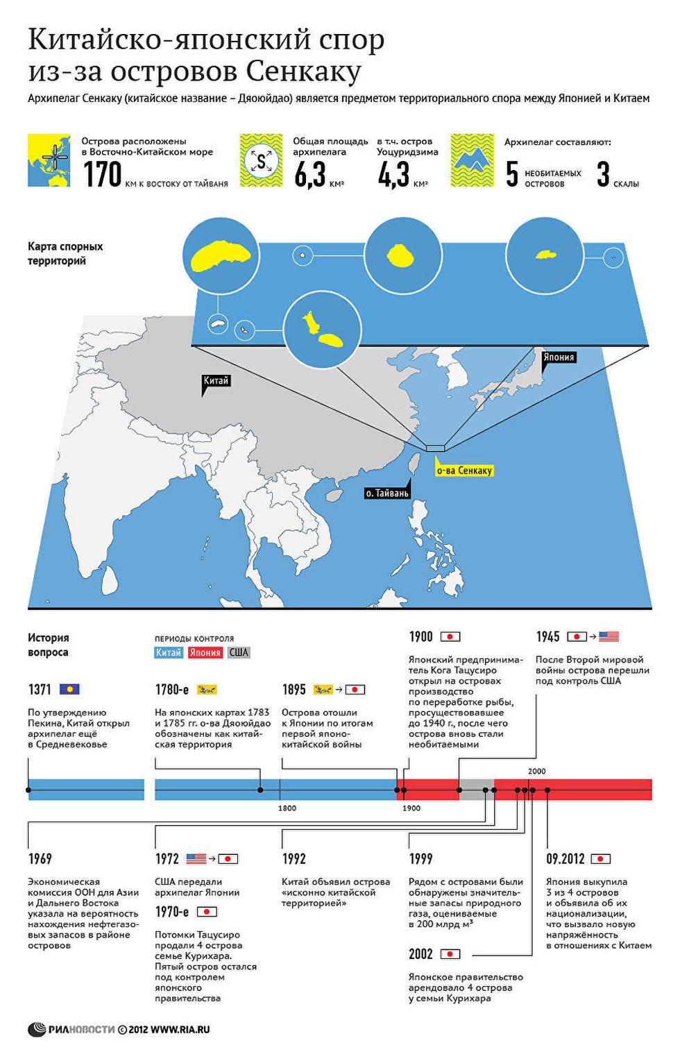 Что касается Восточно-Китайского моря, то здесь спор с 70-х годов прошлого века идёт между Китаем и Японией вокруг острова Сенкаку (китайское название Дяоюйдао). Ситуация обострилась после того, как японское правительство выкупило у частного японского владельца три из пяти островов архипелага Сенкаку.