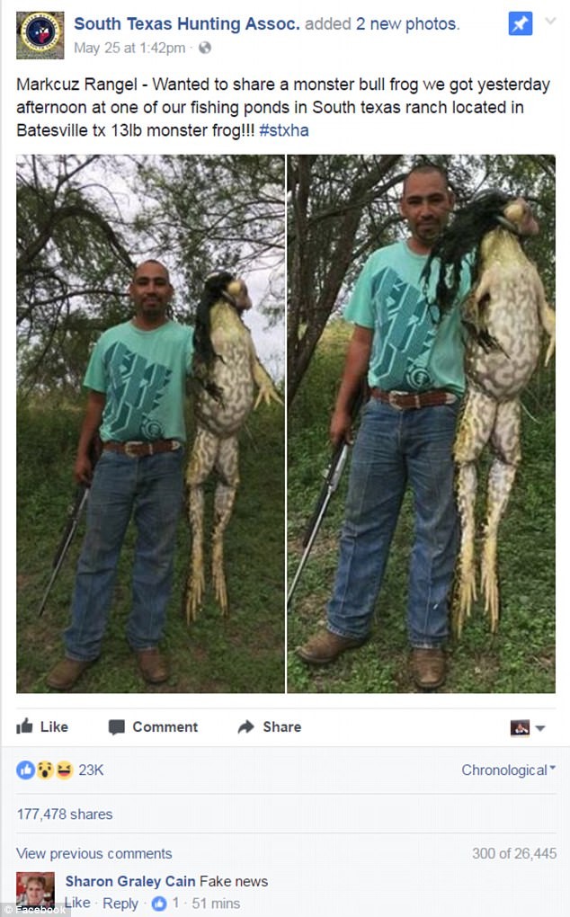 В мае 2017 года житель южной части американского штата Техас опубликовал на Фейсбуке снимки необычного трофея – огромной лягушки. Как утверждает Маркуз Рангель (автор фотографий), такие монстры обитают в пруду на его ранчо в Бейтсвилле.