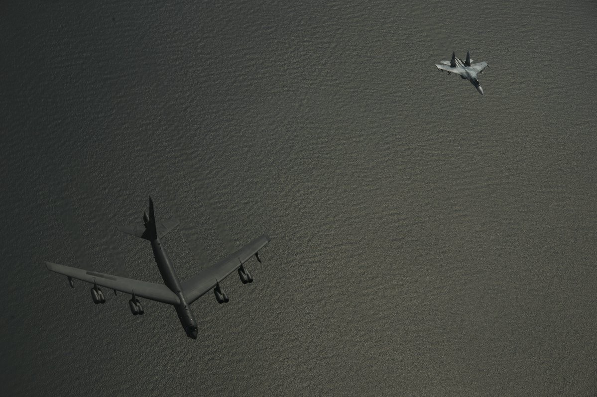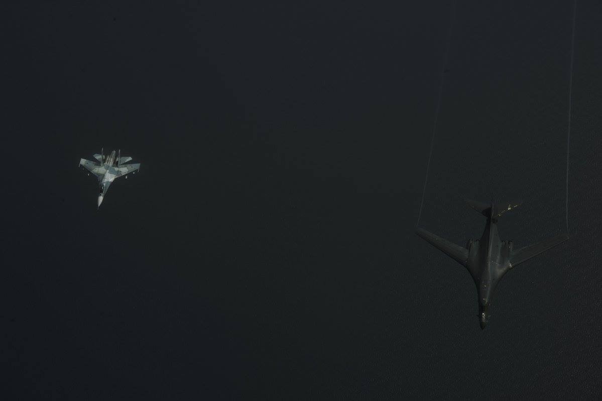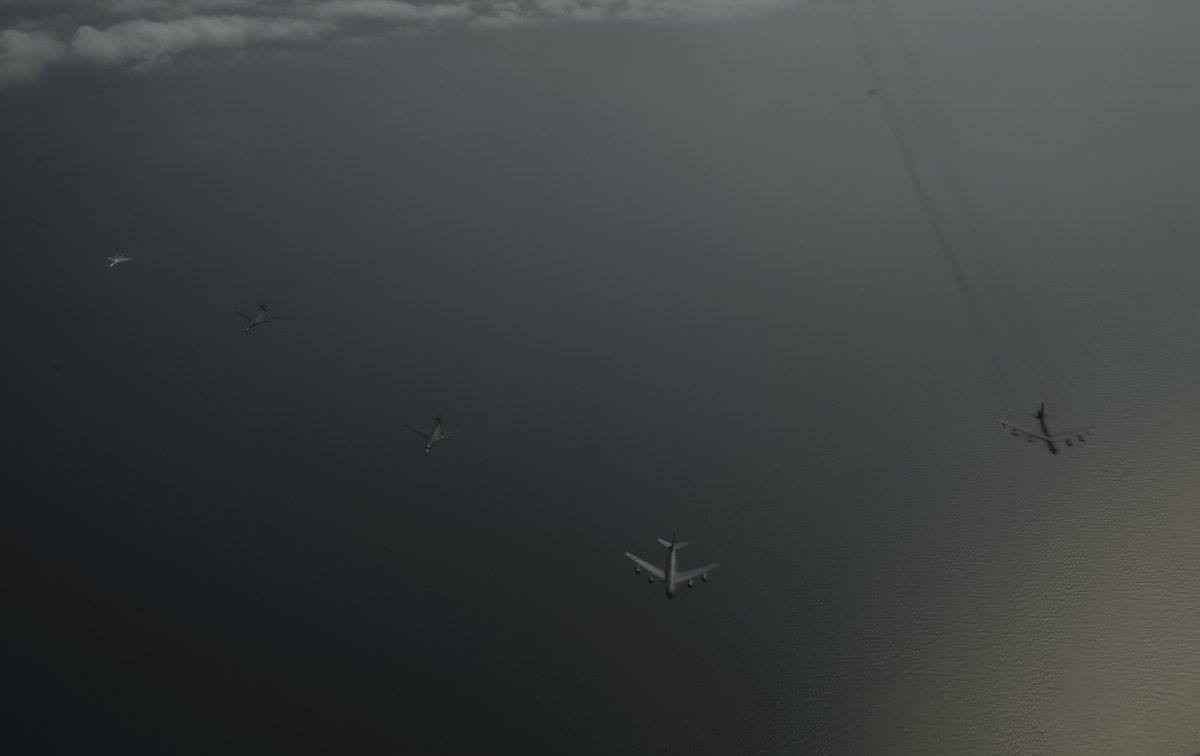 Перехват над Балтийским морем российскими истребителями Су-27 американских стратегических бомбардировщиков В-52Н и В-1В, принимающих участие в учениях НАТО "Saber Strike" и BALTOPS. Снимок сделан с борта самолета-заправщика Boeing KC-135R ВВС США. 09.06.2017 (с) ВВС США