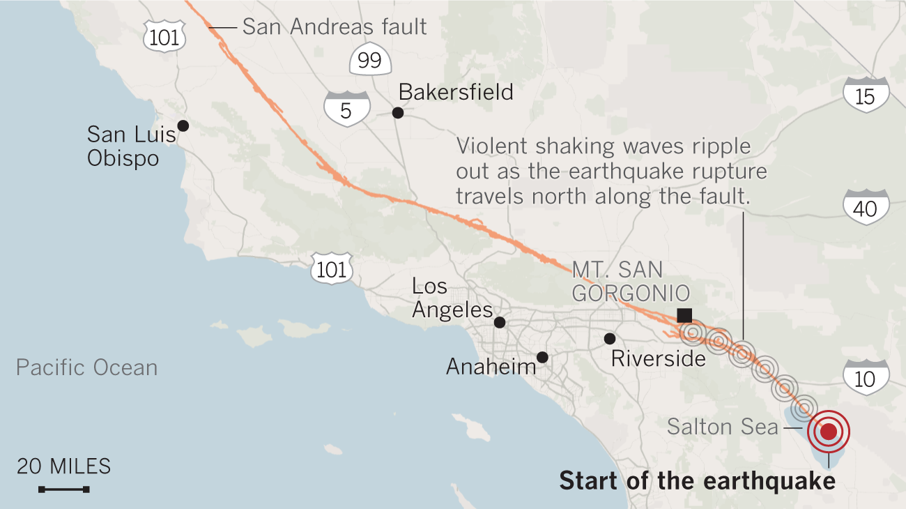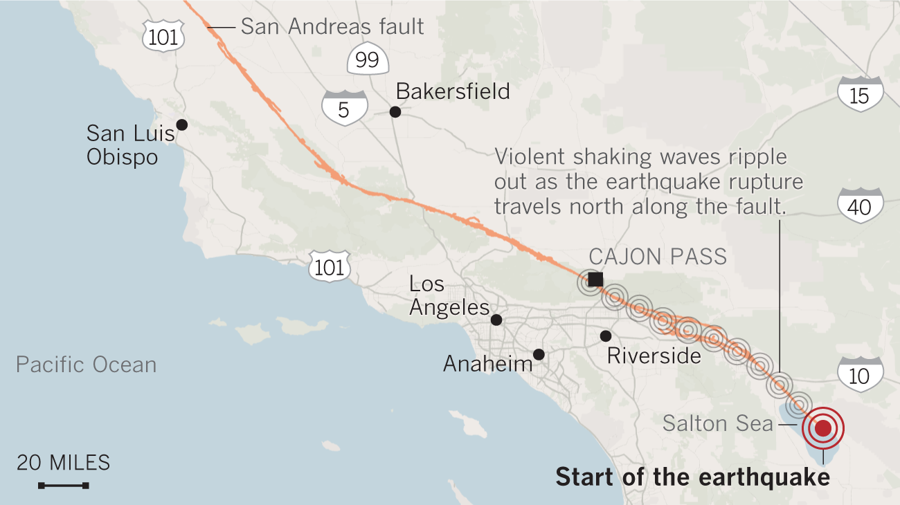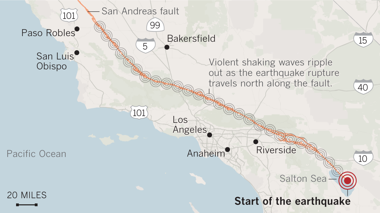 Кейт Шарер, известный эксперт из Геологической службы США, показал журналистам Los Angeles Times много подобных примеров малозаметной сейсмической активности. Однако самой ужасающей демонстрацией стала компьютерная анимация, моделирующая землетрясение в Солтонском море и порождающее сейсмические толчки, волнами идущие на Лос-Анджелес: