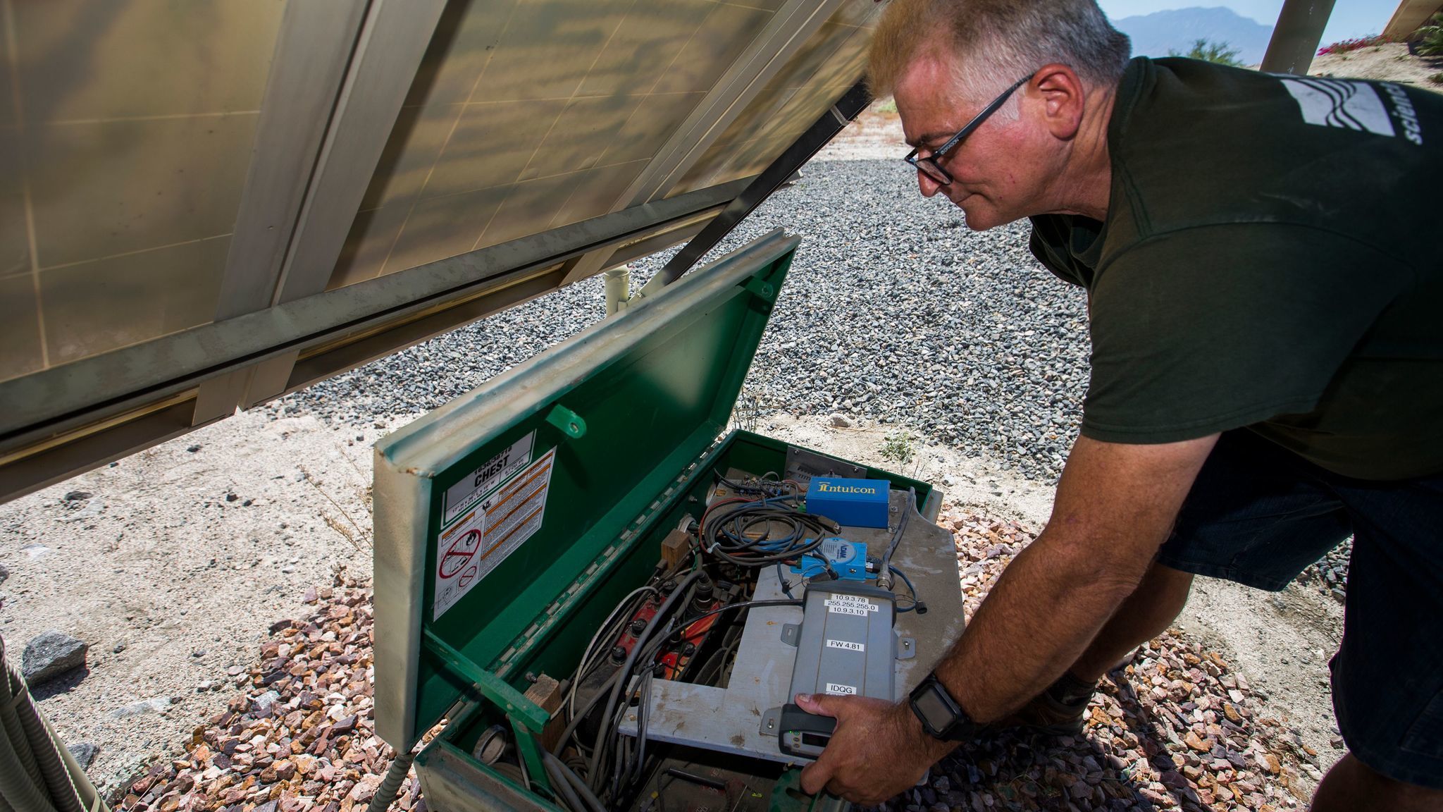 Арис Аспиотес, полевой инженер с USGS, демонстрирует Los Angeles Times датчик землетрясения, который измеряет движение на разломе.