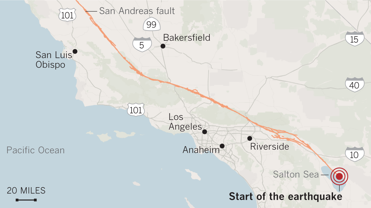 Удивленные журналисты спросили сейсмолога: как городу угрожает землетрясение, которое началось так далеко, ведь Солтонское море находится от Лос-Анджелеса более чем за сотню миль? Тогда специально для Los Angeles Times были продемонстрированы сейсмические карты и графики, в которых точками указывается эпицентр того или иного землетрясения:
