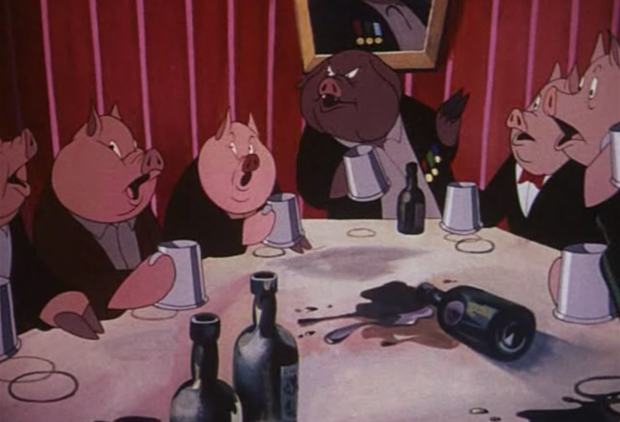 По причине дремучести большинства животных свиньи решили сократить все положения скотизма до единственной максимы: «четыре ноги хорошо, две — плохо!»