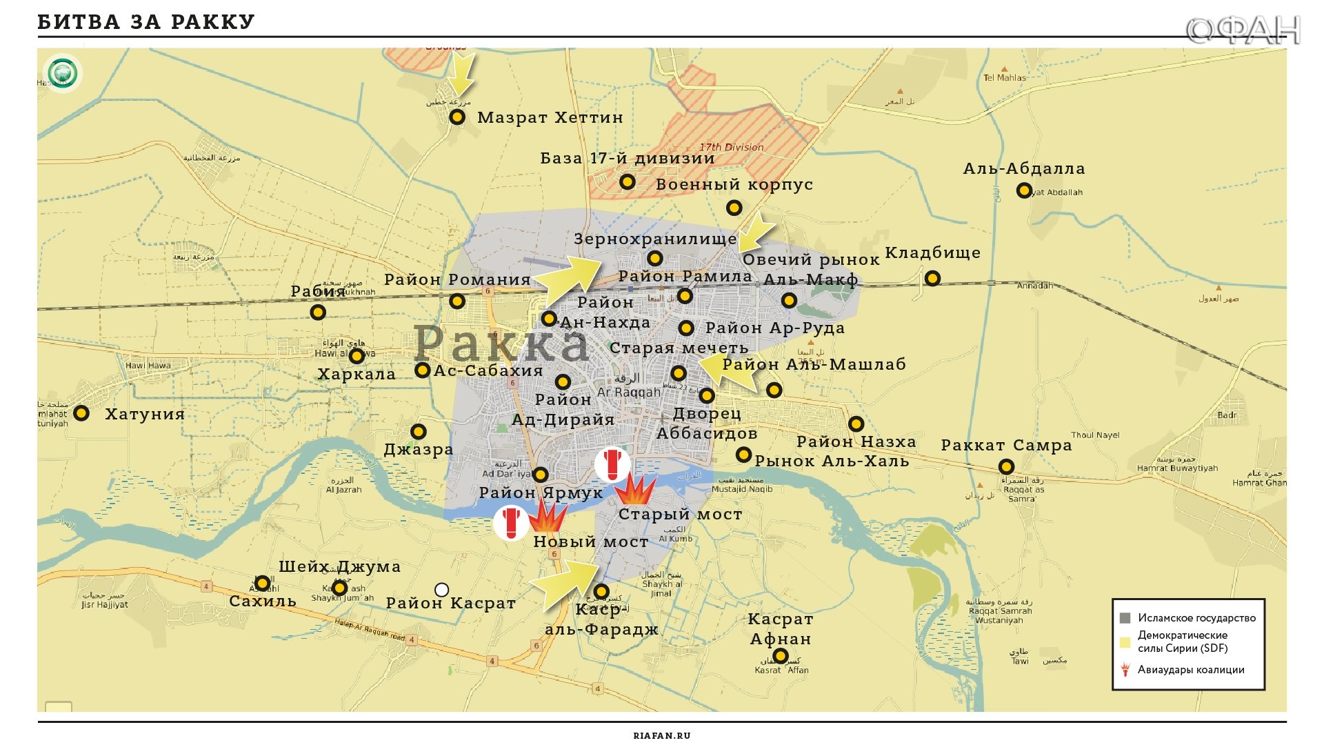 СДС при поддержке коалиции во главе с США пробили брешь в обороне ИГИЛ в Старой Ракке и заняли Дворец Дев, а также школу Абдул Малик. На данной территории продолжают идти напряженные бои. Если СДС смогут добиться существенного продвижения на территории Старой Ракки, то их шансы на скорое освобождение Ракки возрастут. Старая часть города является ключевой точкой обороны ИГИЛ.