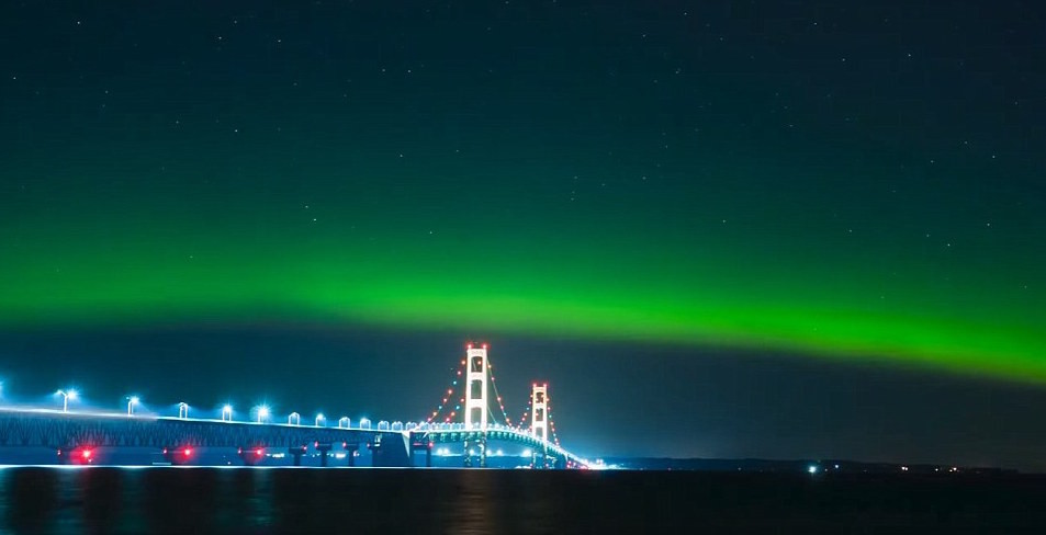 Жители северной части Соединённых Штатов Америки стали свидетелями редкого по красоте природного явления — полярного сияния. Кадры с небесными всполохами над мостом Макинак опубликовал на своей странице в "Твиттере" телеканал ABC.