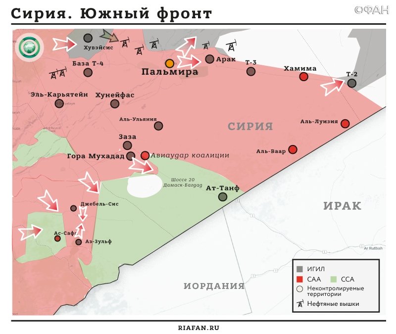 По данным начальника Главного оперативного управления Генштаба России, сирийские войска ведут успешное наступление на юге страны. При этом ИГИЛовцы были выбиты из города Эль-Буда, взят под контроль газораспределительный комплекс Т-2, продолжается наступление в направлении города Абу-Кемаль, до которого осталось 26 километров.