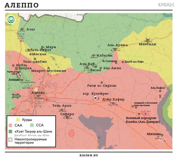 В воскресение Хайят Тахрир Аш-Шам полностью заняла город Идлиб, захватив оставшиеся на территории города командные пункты и блокпосты Ахрар Аш-Шам. Боевики Ахрар Аш-Шам оказали слабое сопротивление боевикам Хайят Тахрир Аш-Шам и после череды боев ушли из города. Между тем, в районе круговой развязки Аль-Зираа в Идлибе в результате атаки автомобиля-смертника уничтожено 13 боевиков Хайят Тахрир Аш-Шам, дюжины – получили ранения. Пока что не известно, кто стоит за терактом – ИГИЛ или Ахрар Аш-Шам. Возможно, ИГИЛ пытается распалить вражду между боевиками в Идлибе, чтобы нарастить свое влияние в данной провинции.