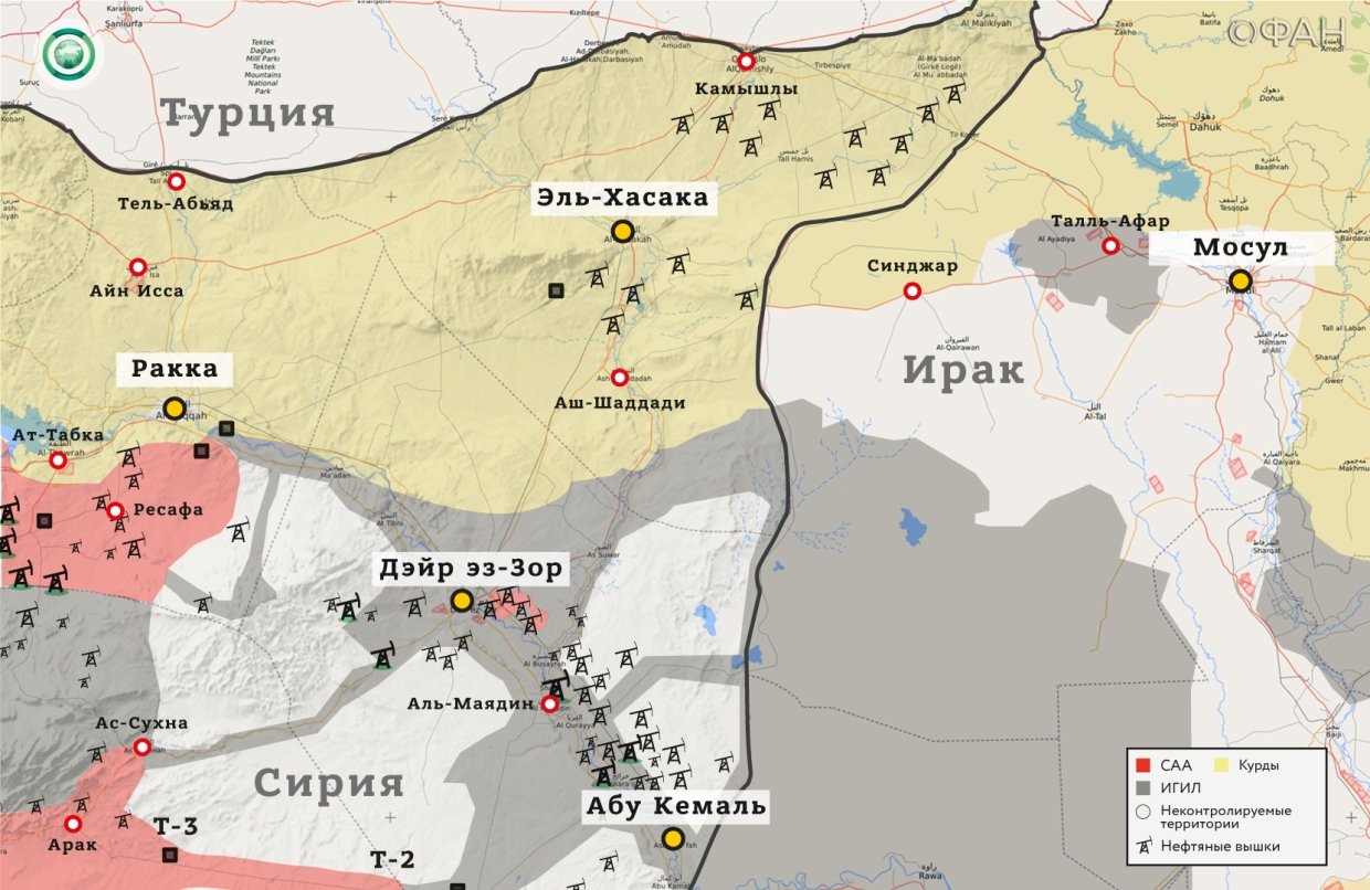 Провинция ХасакаРазворачиваются бои между террористами «Исламского государства» и Сирийскими демократическими силами**** (SDF) в районе населенного пункта Аз-Заянат южнее города Аш-Шаддади. Об этом сообщает военный источник в социальной сети Twitter (alhaskaalhadth). Информации о потерях сторон пока не поступало. Вооруженные столкновения на линии соприкосновения сил ИГИЛ и курдов происходят постоянно. Тем не менее противники уже долгое время неизменно сохраняют свои позиции.