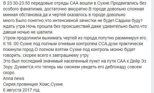 Правительственные войска Сирии вместе с войсками союзников установили контроль над городом Эс-Сухна, который являлся оплотом ИГ* в провинции Хомс. Таким образом, стал открыт путь к наступлению на провинцию Дейр эз-Зор, оккупированную боевиками.