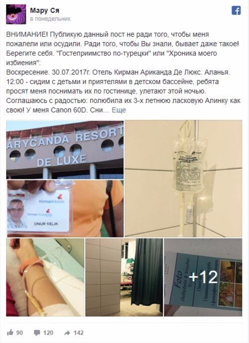 По словам женщины, которая зарегистрирована в соцсети как Мару Ся, она вместе с семьей отдыхала в пятизвездочной гостинице Kirman Hotels Arycanda De Luxe в Аланье.