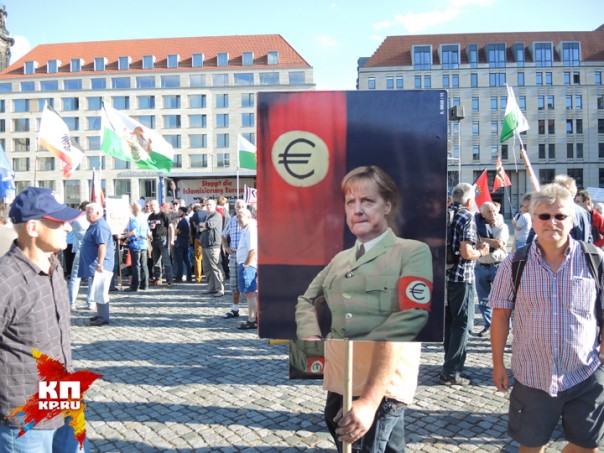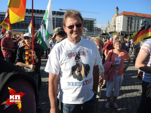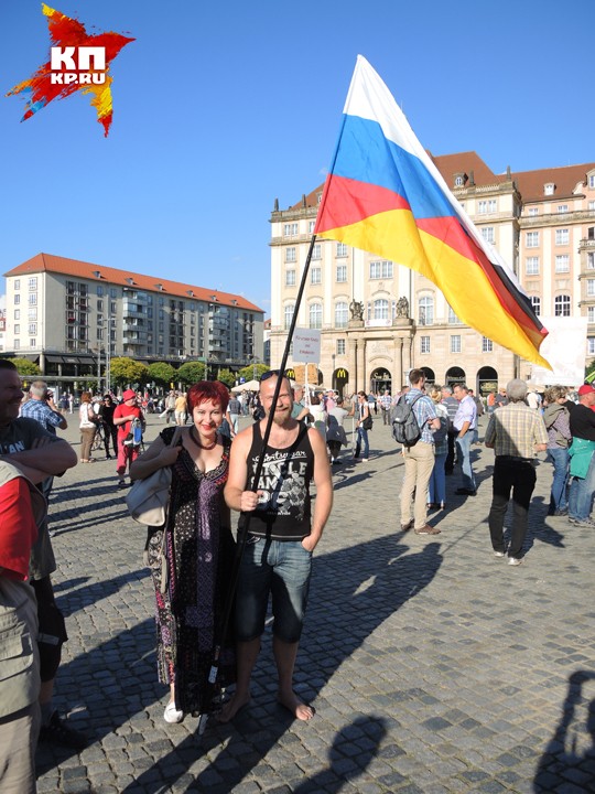 Понедельник. Центр Дрездена, окруженный множеством полицейских машин. Музыканты в народных костюмах играют народные песни, им подпевают немолодые женщины и мужчины, весело притоптывая ногами. Немало и молодых мужчин с вызывающим выражением лица. То, что я вижу, повергает меня в столбняк. Повсюду гордо развеваются русские флаги. Один флаг просто удивителен: наполовину немецкий, наполовину русский. Знаменосец пытается мне объяснить на плохом русском, что его флаг символизирует единство русских и немцев. Множество парней в футболках с портретом Путина. Плакаты с Путиным и рядом Меркель с ушами свиньи. Или Меркель в нацистской форме со знаком евро, напоминающем свастику. Плакаты с мусульманскими женщинами в бурках, перечеркнутые крест-накрест. Призывы к «дружбе с Россией» и «войне с НАТО». Люди, где я? Это Германия?