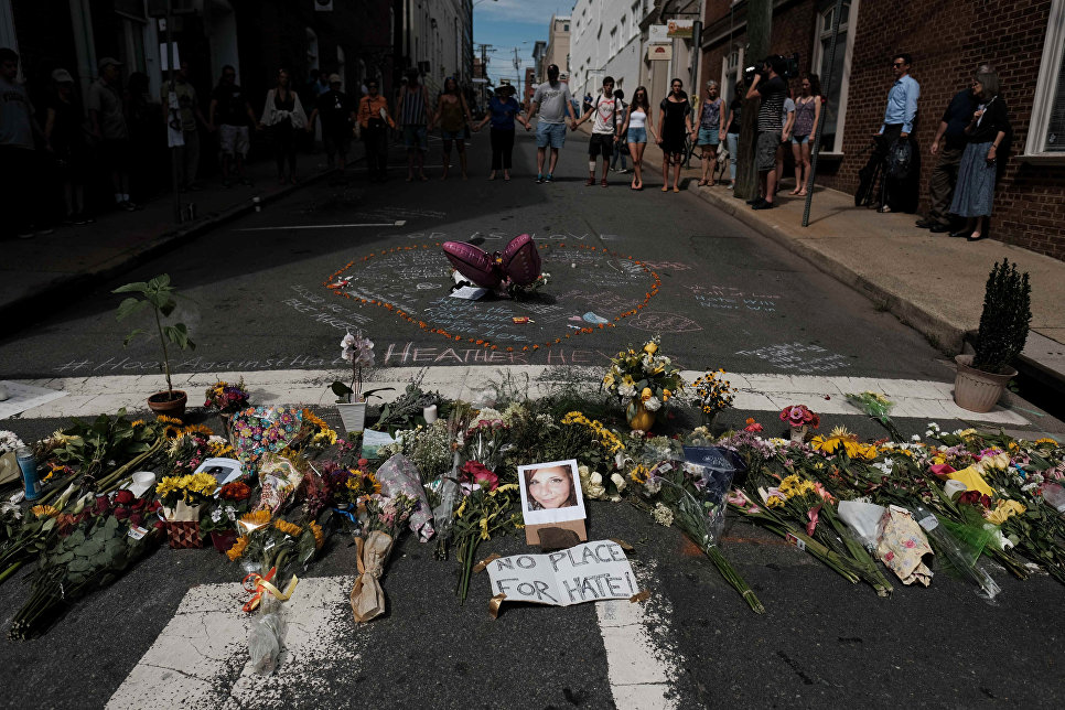 Цветы и фотография погибшей на месте наезда автомобиля на участников протестов в Шарлоттсвилле, штат Вирджиния. 13 августа 2017