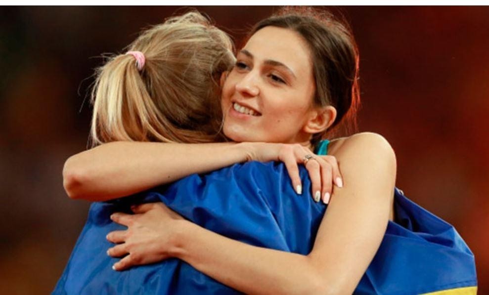 Украинская прыгунья в высоту Юлия Левченко обняла россиянку Марию Ласицкене и накрыла ее украинским флагом на чемпионате мира.