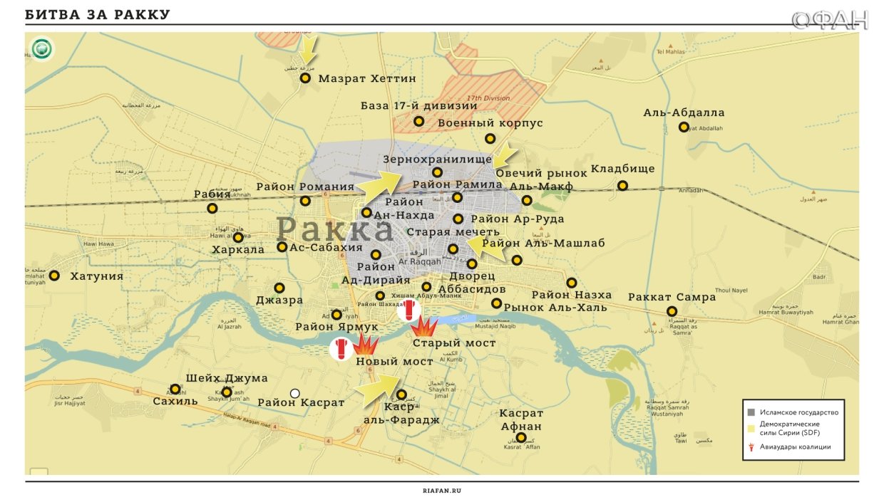 В административном центре провинции Ракка продолжаются ожесточенные бои между Демократическими силами Сирии (SDF) и террористами «Исламского государства». Местный источник в Twitter (@Raqqa_SL) пишет, что в эпицентре боевых действий в городе Ракка находится мечеть Аль-Нур.